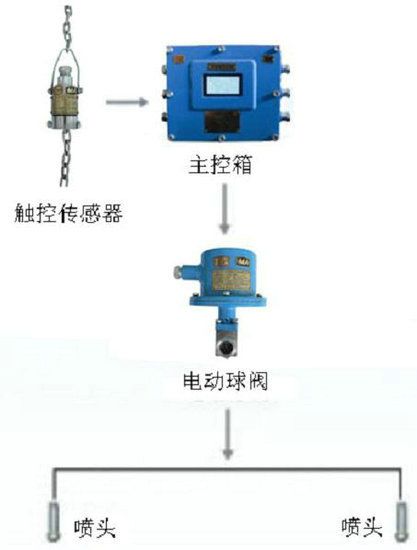 當皮帶運輸機輸煤時,煤流觸動傳感器探桿,觸控傳感器接收到信號觸發主控箱控制電路,打開電動球閥,裝置自動灑水降塵,無物料時延時一段時間后停止噴霧(延時可調)。